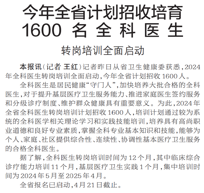 记者昨日从省卫生健康委获悉,2024年全科医生转岗培训全面启动,今年全省计划招收1600人。(今日《郑州日报》2版)