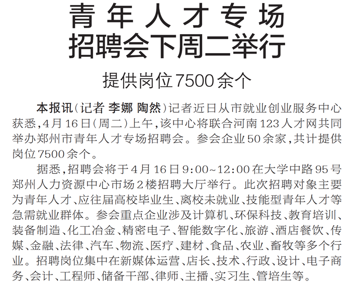 记者近日从市就业创业服务中心获悉,4月16日(周二)上午,该中心将联合河南123人才网共同举办郑州市青年人才专场招聘会。参会企业50余家,共计提供岗位7500余个。(今日《郑州日报》2版)