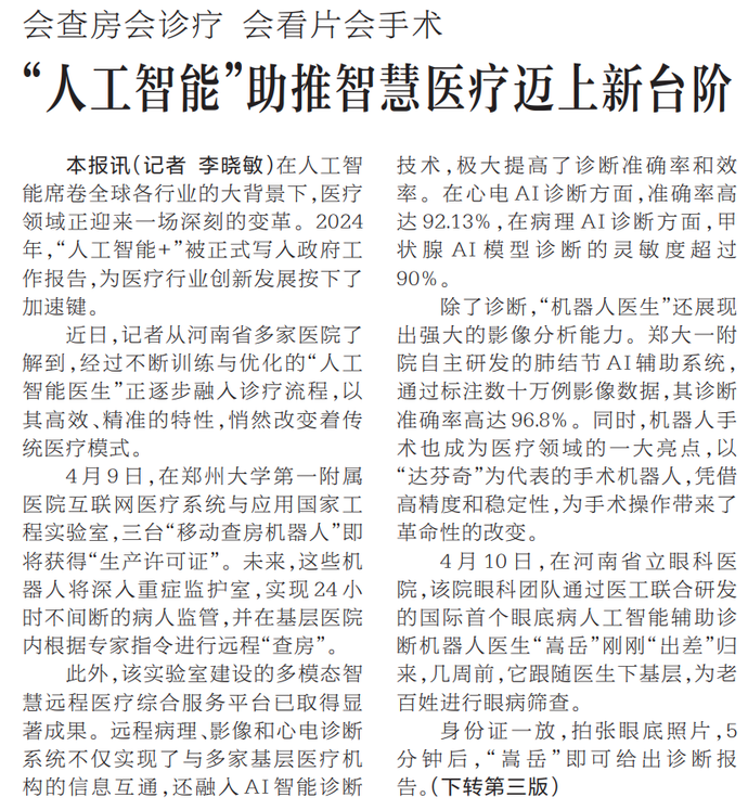 在人工智能席卷全球各行业的大背景下,医疗领域正迎来一场深刻的变革。2024年,“人工智能+”被正式写入政府工作报告,为医疗行业创新发展按下了加速键。(今日《河南日报》1版、3版)