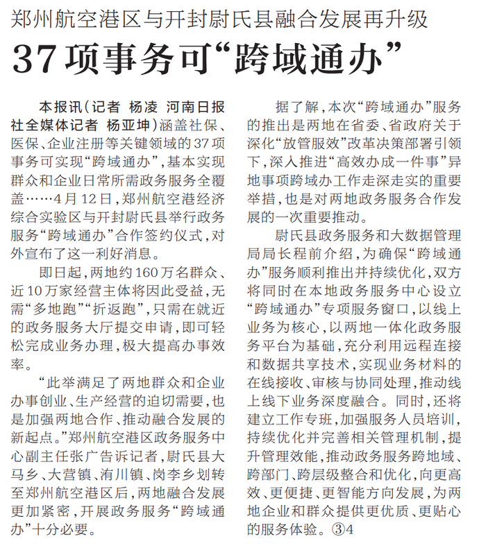 涵盖社保、医保、企业注册等关键领域的37项事务可实现“跨域通办”,基本实现群众和企业日常所需政务服务全覆盖……4月12日,郑州航空港经济综合实验区与开封尉氏县举行政务服务“跨域通办”合作签约仪式,对外宣布了这一利好消息。(今日《河南日报》3版)