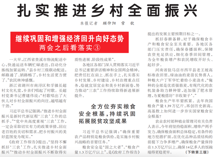 习近平总书记强调:“推进乡村全面振兴是新时代新征程‘三农’工作的总抓手。”“党中央高度重视‘三农’工作,一定会采取切实有力的政策举措,回应老百姓的关切和需求,把乡村振兴的美好蓝图变为现实。”(今日《人民日报》1版、3版)