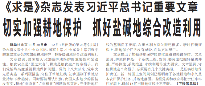 12月1日出版的第23期《求是》杂志将发表中共中央总书记、国家主席、中央军委主席习近平的重要文章《切实加强耕地保护 抓好盐碱地综合改造利用》。(今日《人民日报》1版、3版)