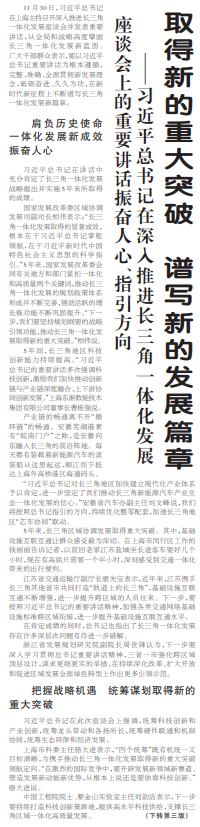 11月30日,习近平总书记在上海主持召开深入推进长三角一体化发展座谈会并发表重要讲话,从全局和战略高度擘画长三角一体化发展新蓝图。广大干部群众表示,要以习近平总书记重要讲话为根本遵循,完整、准确、全面贯彻新发展理念,砥砺奋进、久久为功,在新时代新征程上不断谱写长三角一体化发展新篇章。(今日《人民日报》1版、3版)
