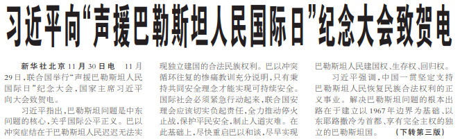 11月29日,联合国举行“声援巴勒斯坦人民国际日”纪念大会,国家主席习近平向大会致贺电。(今日《人民日报》1版、3版)