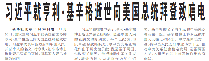 11月30日,国家主席习近平就美国前国务卿亨利·基辛格逝世向美国总统拜登致唁电。习近平代表中国政府和中国人民,并以个人的名义,对亨利·基辛格博士逝世表示深切的哀悼,向其家人表示诚挚的慰问。(今日《人民日报》1版)