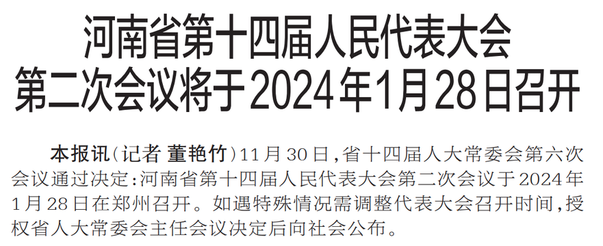 11月30日,省十四届人大常委会第六次会议通过决定:河南省第十四届人民代表大会第二次会议于2024年1月28日在郑州召开。如遇特殊情况需调整代表大会召开时间,授权省人大常委会主任会议决定后向社会公布。(今日《郑州日报》1版)