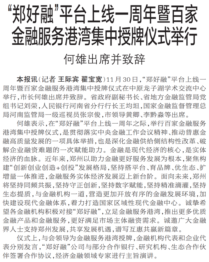 11月30日,“郑好融”平台上线一周年暨百家金融服务港湾集中授牌仪式在中原龙子湖学术交流中心举行,市长何雄出席并致辞。省政府副秘书长、省地方金融监管局党组书记刘荣,人民银行河南省分行行长王均坦,国家金融监督管理总局河南监管局一级巡视员张宗俊,市领导黄卿、李黔淼等出席。(今日《郑州日报》1版)