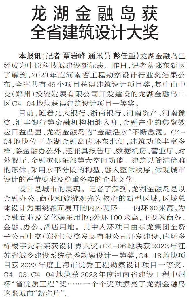 龙湖金融岛已经成为中原科技城建设新标志。昨日,记者从郑东新区了解到,2023年度河南省工程勘察设计行业奖结果公布,全省共有49个项目获得建筑设计项目奖,其中由中交(郑州)投资发展有限公司开发建设的龙湖金融岛二区C4-04地块获得建筑设计项目一等奖。(今日《郑州日报》2版)
