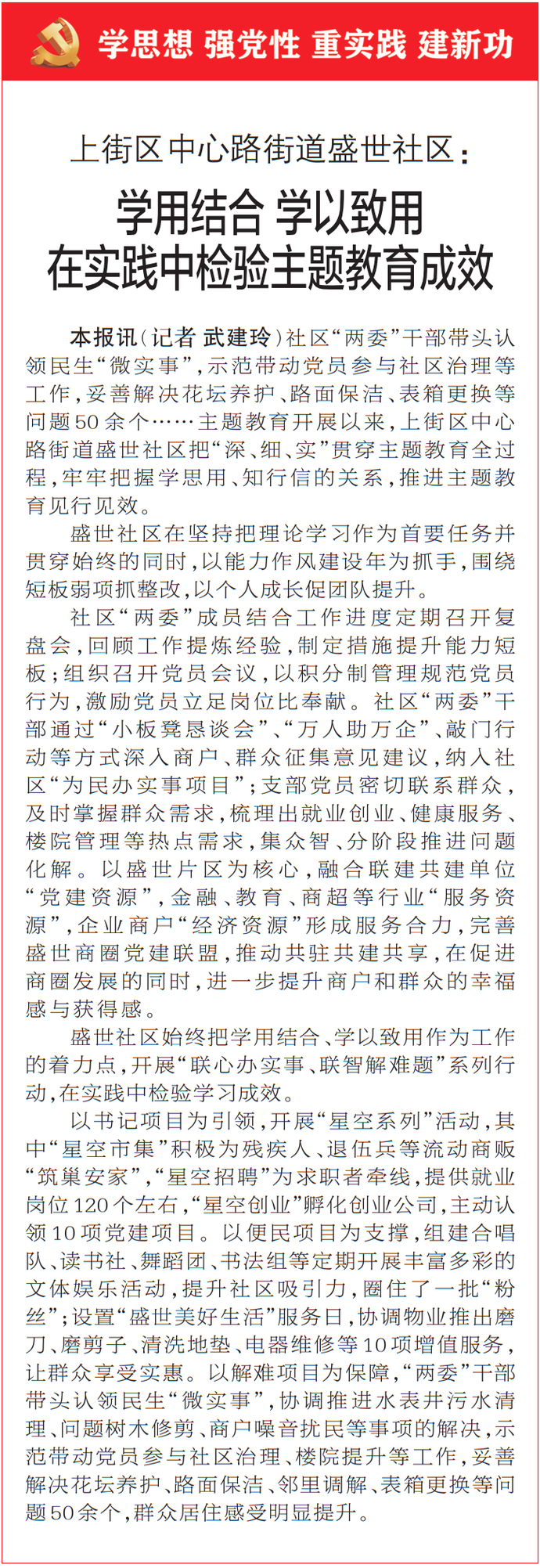 社区“两委”干部带头认领民生“微实事”,示范带动党员参与社区治理等工作,妥善解决花坛养护、路面保洁、表箱更换等问题50余个……主题教育开展以来,上街区中心路街道盛世社区把“深、细、实”贯穿主题教育全过程,牢牢把握学思用、知行信的关系,推进主题教育见行见效。(今日《郑州日报》2版)