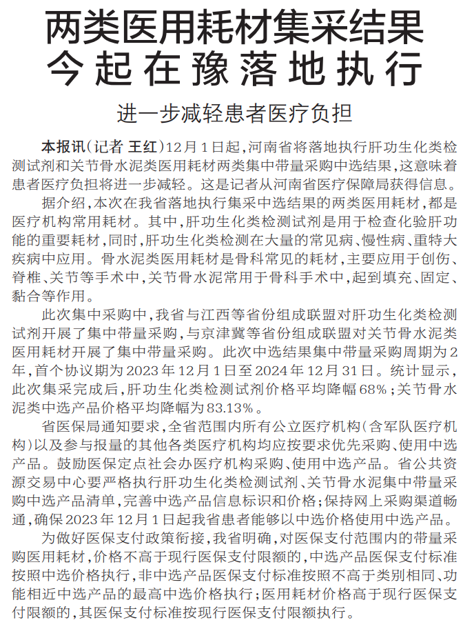 12月1日起,河南省将落地执行肝功生化类检测试剂和关节骨水泥类医用耗材两类集中带量采购中选结果,这意味着患者医疗负担将进一步减轻。这是记者从河南省医疗保障局获得信息。(今日《郑州日报》5版)