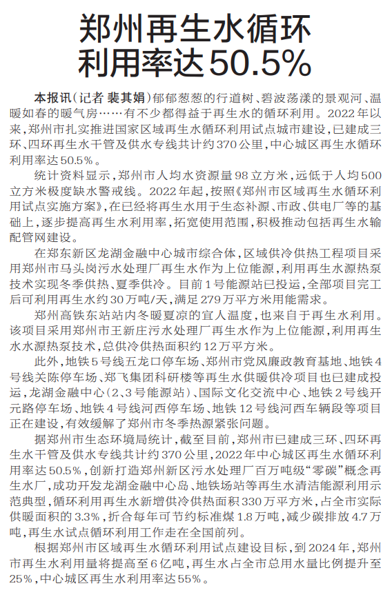 郁郁葱葱的行道树、碧波荡漾的景观河、温暖如春的暖气房……有不少都得益于再生水的循环利用。2022年以来,郑州市扎实推进国家区域再生水循环利用试点城市建设,已建成三环、四环再生水干管及供水专线共计约370公里,中心城区再生水循环利用率达50.5%。(今日《郑州日报》5版)