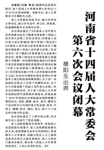 圆满完成各项议程后,省十四届人大常委会第六次会议11月30日在郑州闭幕。省委书记、省人大常委会主任楼阳生出席。