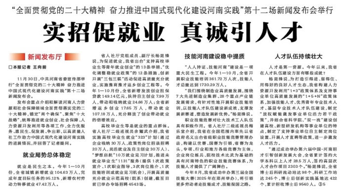 1至10月,全省城镇新增就业104.63万人;全省技能人才总量达到1720.29万人……11月30日,“全面贯彻党的二十大精神奋力推进中国式现代化建设河南实践”系列第十二场新闻发布会召开,介绍和解读河南人力资源社会保障领域在全面贯彻落实党的二十大精神方面的进展情况和成果成效。(今日《郑州日报》2版)
