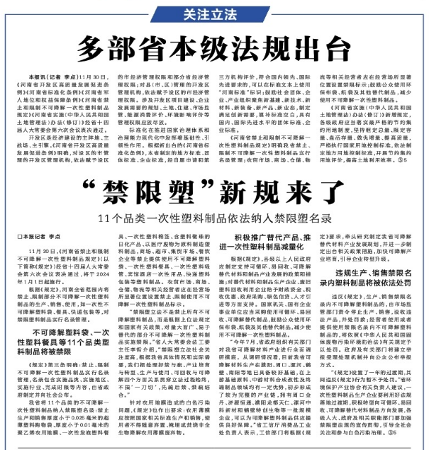 11月30日,《河南省禁止和限制不可降解一次性塑料制品规定》(以下简称《规定》)经省十四届人大常委会第六次会议表决通过,将于2024年1月1日起施行。(今日《河南日报》2版)