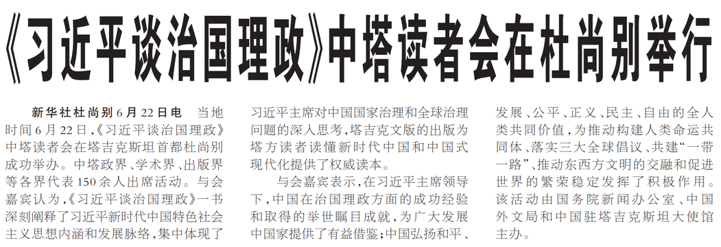 当地时间6月22日,《习近平谈治国理政》中塔读者会在塔吉克斯坦首都杜尚别成功举办。中塔政界、学术界、出版界等各界代表150余人出席活动。与会嘉宾认为,《习近平谈治国理政》一书深刻阐释了习近平新时代中国特色社会主义思想内涵和发展脉络,集中体现了习近平主席对中国国家治理和全球治理问题的深入思考,塔吉克文版的出版为塔方读者读懂新时代中国和中国式现代化提供了权威读本。(今日《人民日报》1版)