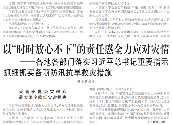 习近平总书记近日对防汛抗旱工作作出重要指示,要求“扎实做好防汛抗旱、抢险救灾各项工作”“切实保障人民群众生命财产安全和社会大局稳定”。(今日《人民日报》1版、3版)