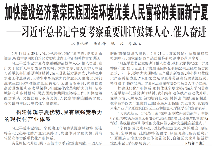 6月19日至20日,习近平总书记在宁夏考察,到银川市调研,听取宁夏回族自治区党委和政府工作汇报并作重要讲话。(今日《人民日报》1版、2版)
