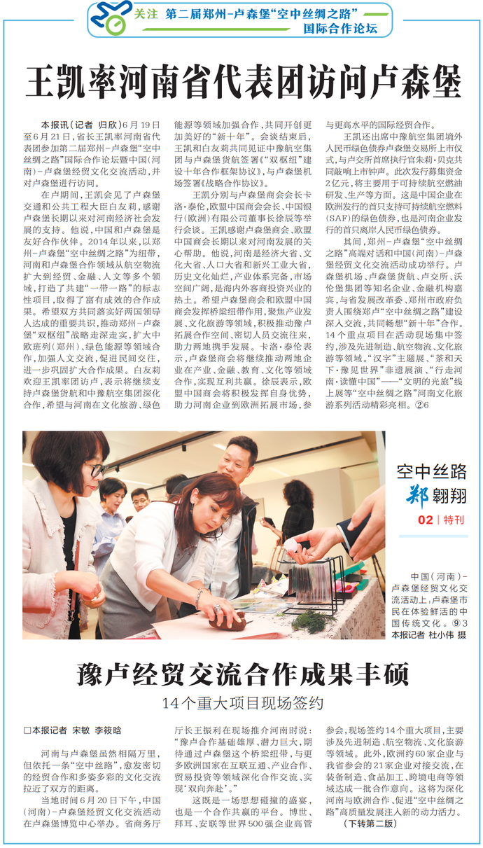 河南与卢森堡虽然相隔万里,但依托一条“空中丝路”,愈发密切的经贸合作和多姿多彩的文化交流拉近了双方的距离。(今日《河南日报》1版、2版)