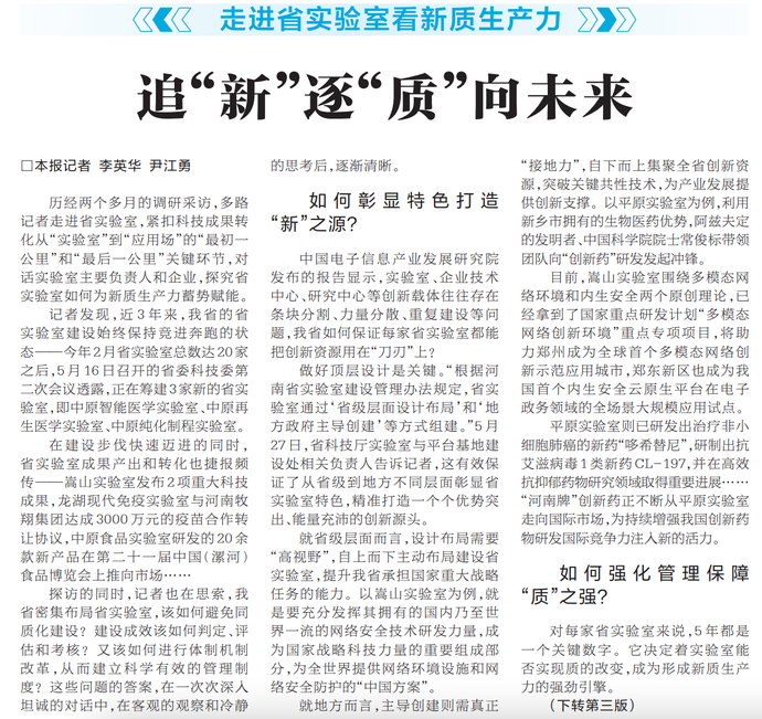 历经两个多月的调研采访,多路记者走进省实验室,紧扣科技成果转化从“实验室”到“应用场”的“最初一公里”和“最后一公里”关键环节,对话实验室主要负责人和企业,探究省实验室如何为新质生产力蓄势赋能。(今日《河南日报》1版、3版)