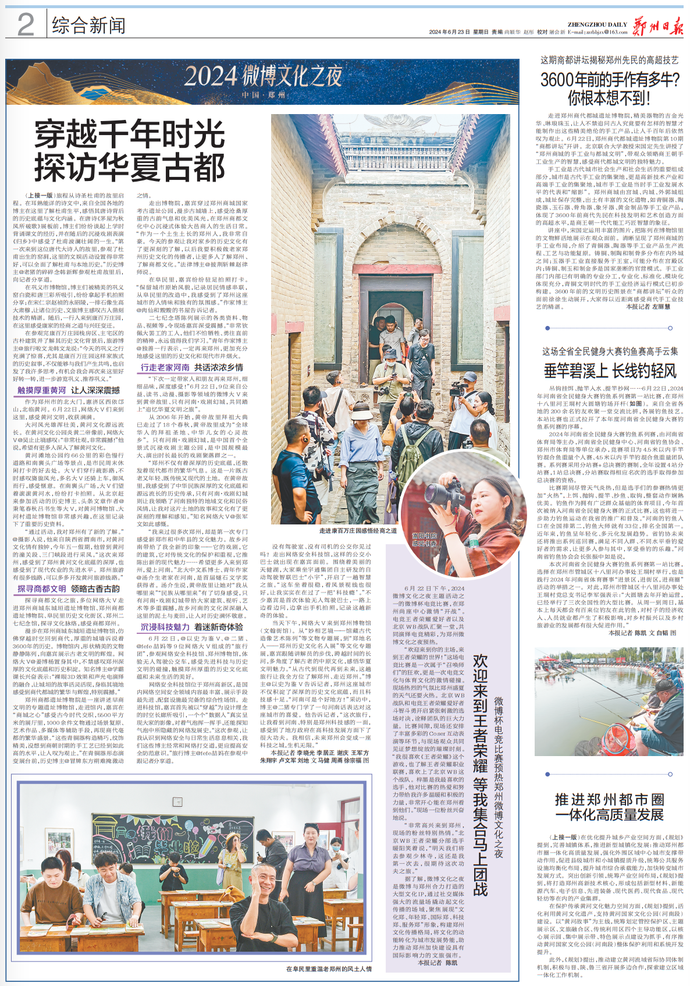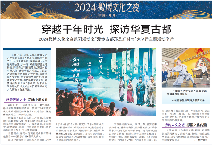 6月21日~22日,2024微博文化之夜系列活动之“漫步古都郑是好时节”大V行主题活动,邀请网络大V走进黄帝故里、少林寺、郑州商都遗址博物院、网络安全科技馆等地,深度体验中原文化,感悟华夏文明魅力。此次活动共有中岳嵩山访武之旅、体验诗韵人文之旅、感受黄河文明之旅、探寻商都文化之旅、追忆华夏文明之旅、体验科技创意之旅6条线路,向来自全国各地的网络大V全方位展示郑州的人文历史与自然风光。(今日《郑州日报》1版、2版)