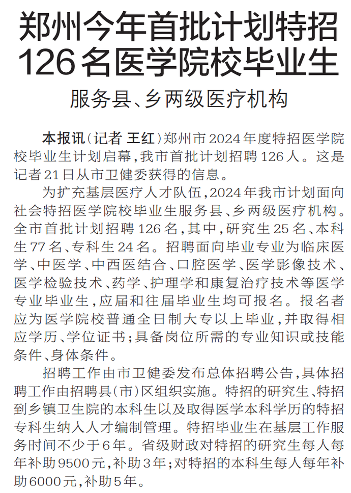 郑州市2024年度特招医学院校毕业生计划启幕,我市首批计划招聘126人。这是记者21日从市卫健委获得的信息。(今日《郑州日报》1版)