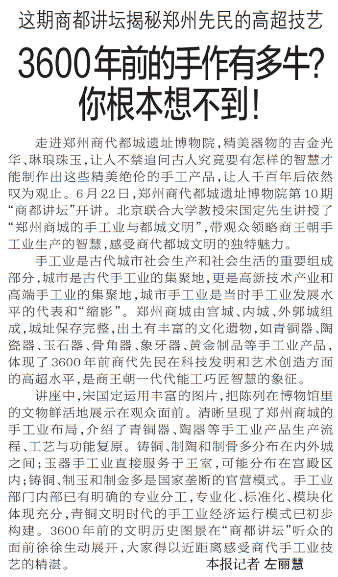 走进郑州商代都城遗址博物院,精美器物的吉金光华、琳琅珠玉,让人不禁追问古人究竟要有怎样的智慧才能制作出这些精美绝伦的手工产品,让人千百年后依然叹为观止。6月22日,郑州商代都城遗址博物院第10期“商都讲坛”开讲。北京联合大学教授宋国定先生讲授了“郑州商城的手工业与都城文明”,带观众领略商王朝手工业生产的智慧,感受商代都城文明的独特魅力。(今日《郑州日报》2版)