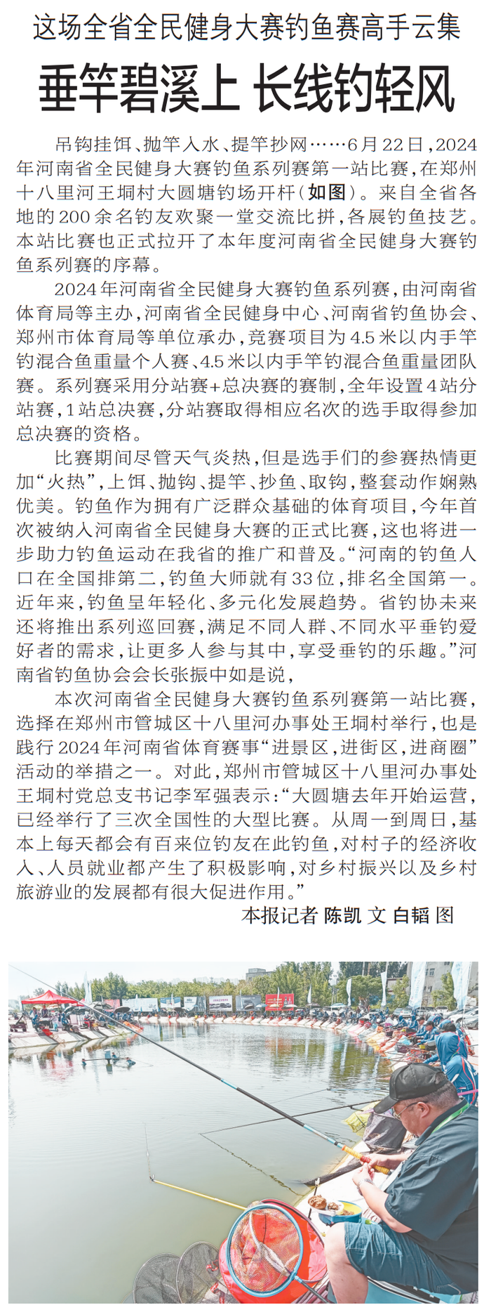 吊钩挂饵、抛竿入水、提竿抄网……6月22日,2024年河南省全民健身大赛钓鱼系列赛第一站比赛,在郑州十八里河王垌村大圆塘钓场开杆。来自全省各地的200余名钓友欢聚一堂交流比拼,各展钓鱼技艺。本站比赛也正式拉开了本年度河南省全民健身大赛钓鱼系列赛的序幕。(今日《郑州日报》2版)