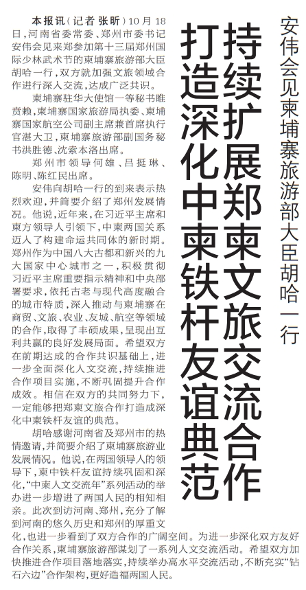 10月18日,河南省委常委、郑州市委书记安伟会见来郑参加第十三届郑州国际少林武术节的柬埔寨旅游部大臣胡哈一行,双方就加强文旅领域合作进行深入交流,达成广泛共识。