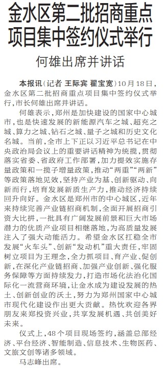 10月18日,金水区第二批招商重点项目集中签约仪式举行,市长何雄出席并讲话。(今日《郑州日报》1版)