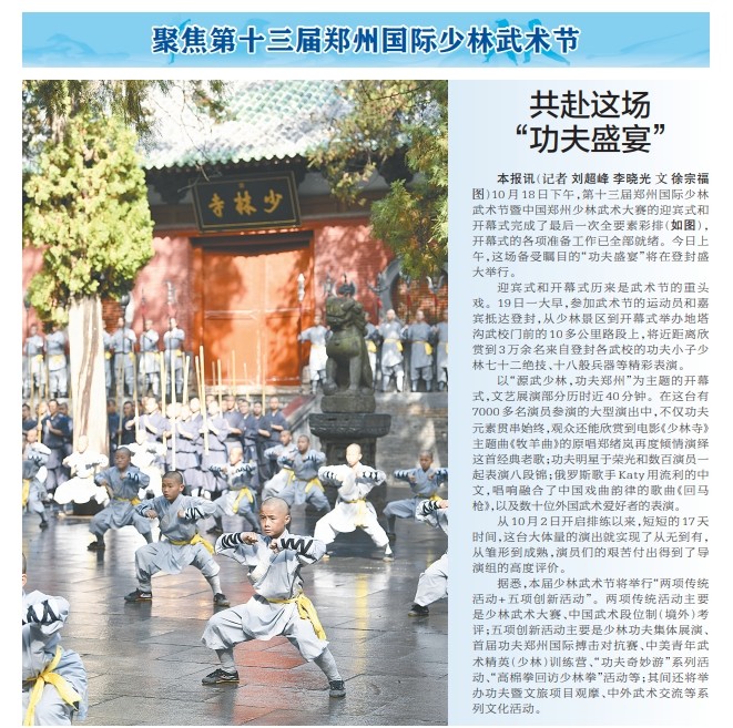 10月18日下午,第十三届郑州国际少林武术节暨中国郑州少林武术大赛的迎宾式和开幕式完成了最后一次全要素彩排(如图),开幕式的各项准备工作已全部就绪。今日上午,这场备受瞩目的“功夫盛宴”将在登封盛大举行。(今日《郑州日报》1版)