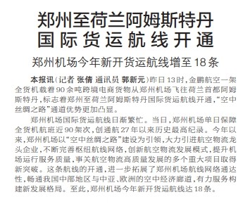 昨日13时,金鹏航空一架全货机载着90余吨跨境电商货物从郑州机场飞往荷兰首都阿姆斯特丹,标志着郑州至荷兰阿姆斯特丹国际货运航线开通,“空中丝绸之路”通道优势更加凸显。(今日《郑州日报》1版)