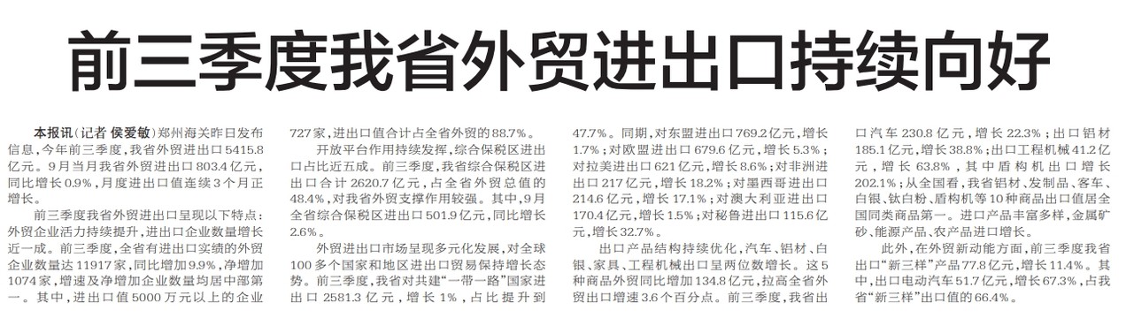 郑州海关昨日发布信息,今年前三季度,我省外贸进出口5415.8亿元。9月当月我省外贸进出口803.4亿元,同比增长0.9%,月度进出口值连续3个月正增长。(今日《郑州日报》2版)