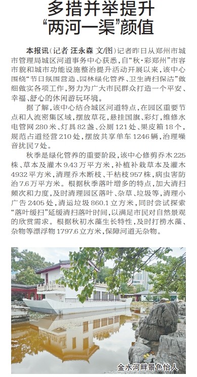 记者昨日从郑州市城市管理局城区河道事务中心获悉,自“秋·彩郑州”市容市貌和城市功能设施整治提升活动开展以来,该中心围绕“节日氛围营造、园林绿化管养、卫生清扫保洁”做细做实各项工作,努力为广大市民群众打造一个平安、幸福、舒心的休闲游玩环境。(今日《郑州日报》2版)