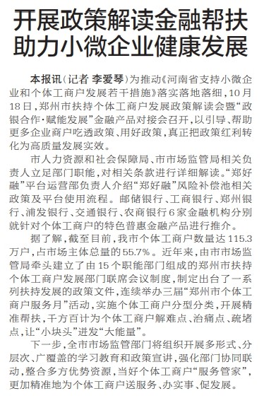 为推动《河南省支持小微企业和个体工商户发展若干措施》落实落地落细,10月18日,郑州市扶持个体工商户发展政策解读会暨“政银合作·赋能发展”金融产品对接会召开,以引导、帮助更多企业商户吃透政策、用好政策,真正把政策红利转化为高质量发展实效。(今日《郑州日报》2版)