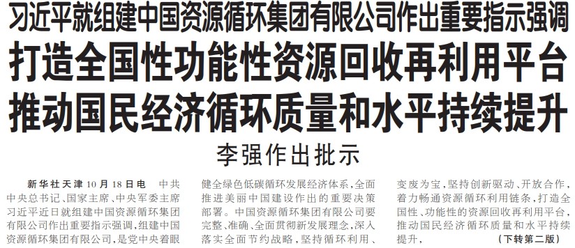 中共中央总书记、国家主席、中央军委主席习近平近日就组建中国资源循环集团有限公司作出重要指示强调,组建中国资源循环集团有限公司,是党中央着眼健全绿色低碳循环发展经济体系,全面推进美丽中国建设作出的重要决策部署。中国资源循环集团有限公司要完整、准确、全面贯彻新发展理念,深入落实全面节约战略,坚持循环利用、变废为宝,坚持创新驱动、开放合作,着力畅通资源循环利用链条,打造全国性、功能性的资源回收再利用平台,推动国民经济循环质量和水平持续提升,为以中国式现代化全面推进强国建设、民族复兴伟业作出积极贡献。(今日《人民日报》1版、2版)