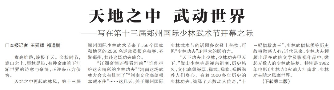 天地之中再起武林风。第十三届郑州国际少林武术节来了,56个国家和地区的2560名运动员报名参赛、齐聚郑州,共赴这场功夫盛会。(今日《河南日报》1版、2版)