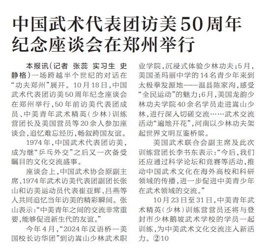 一场跨越半个世纪的对话在“功夫郑州”展开。10月18日,中国武术代表团访美50周年纪念座谈会在郑州举行,50年前访美代表团成员、中美青年武术精英(少林)训练营团长及美国营员等20余人参加座谈会,追忆难忘经历,畅叙跨国友谊。(今日《河南日报》3版)