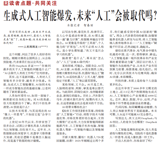 我向DeepSeek求证——“你被问最多的关于人工智能的问题是什么?”“AI会取代人类的工作吗?”位列榜首。(今日《人民日报》1版)