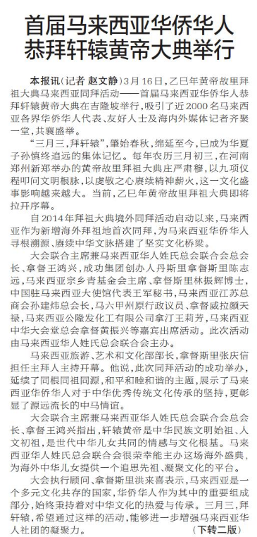 3月16日,乙巳年黄帝故里拜祖大典马来西亚同拜活动——首届马来西亚华侨华人恭拜轩辕黄帝大典在吉隆坡举行,吸引了近2000名马来西亚各界华侨华人代表、友好人士及海内外媒体记者齐聚一堂,共襄盛举。(今日《郑州日报》1版、2版)