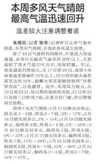 记者昨日从市气象台获悉,本周天气晴朗、升温和多风是主旋律。(今日《郑州日报》1版)