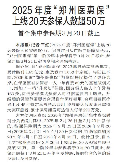2025年度“郑州医惠保”上线20天参保人员突破50万。记者昨日从市医疗保障局获悉,“郑州医惠保”第一阶段集中参保将于3月20日截止,参保居民3月21日起可享相应医保待遇。(今日《郑州日报》1版)