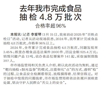 3月15日,我省启动2025年“百姓点检日”活动,记者从活动现场获悉,2024年,我市累计完成食品抽检4.8万批次,合格率96%以上。(今日《郑州日报》2版)