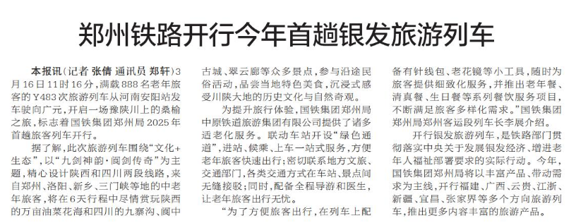 3月16日11时16分,满载888名老年旅客的Y483次旅游列车从河南安阳站发车驶向广元,开启一场豫陕川上的桑榆之旅,标志着国铁集团郑州局2025年首趟旅客列车开行。(今日《郑州日报》2版)