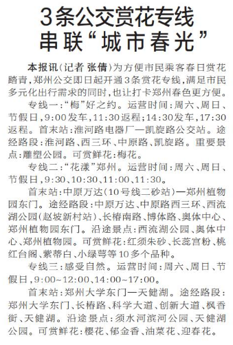 为方便市民乘客春日赏花踏青,郑州公交即日起开通3条赏花专线,满足市民多元化出行需求的同时,也让打卡郑州春色更方便。(今日《郑州日报》2版)