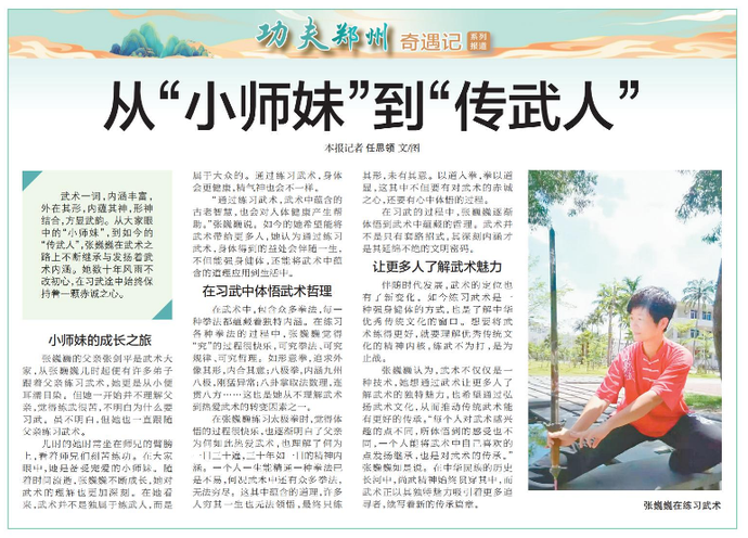 武术一词,内涵丰富,外在其形,内蕴其神,形神结合,方显武韵。从大家眼中的“小师妹”,到如今的“传武人”,张巍巍在武术之路上不断继承与发扬着武术内涵。她数十年风雨不改初心,在习武途中始终保持着一颗赤诚之心。(今日《郑州日报》6版)