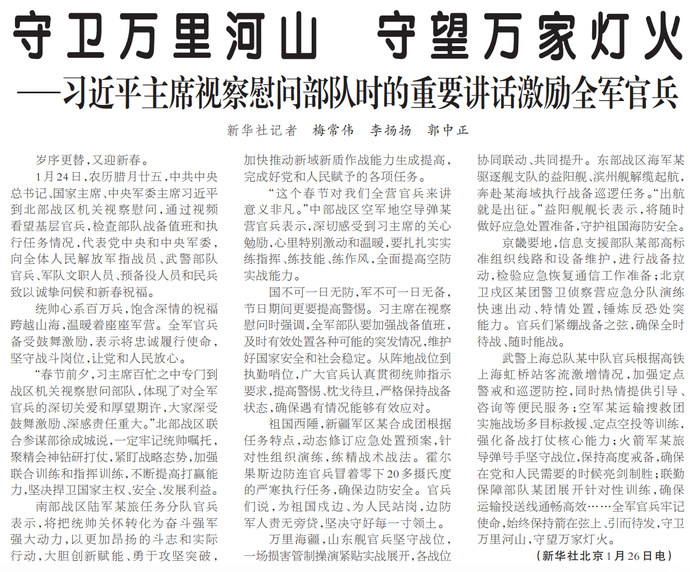 1月24日,农历腊月廿五,中共中央总书记、国家主席、中央军委主席习近平到北部战区机关视察慰问,通过视频看望基层官兵,检查部队战备值班和执行任务情况,代表党中央和中央军委,向全体人民解放军指战员、武警部队官兵、军队文职人员、预备役人员和民兵致以诚挚问候和新春祝福。(今日《人民日报》1版)