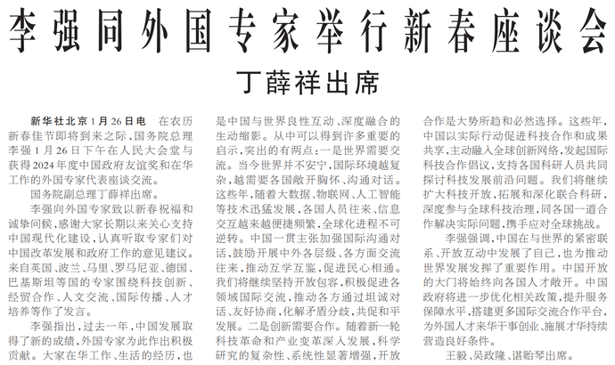 在农历新春佳节即将到来之际,国务院总理李强1月26日下午在人民大会堂与获得2024年度中国政府友谊奖和在华工作的外国专家代表座谈交流。(今日《人民日报》1版)