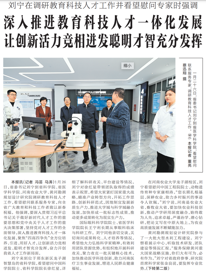 1月26日,省委书记刘宁到省科学院、省医学科学院、河南农业大学、黄河勘测规划设计研究院调研教育科技人才工作,看望慰问联系服务专家,向全省广大教育和科技工作者致以新春祝福。他强调,要深入贯彻习近平总书记关于做好新时代人才工作的重要思想和党中央关于人才工作的重大决策部署,坚持党对人才工作的全面领导,深入推进教育科技人才一体化发展,聚焦“四高四争先”全方位培养、引进、用好人才,让创新活力竞相迸发、聪明才智充分发挥,奋力开创我省人才工作新局面。(今日《河南日报》1版、2版)