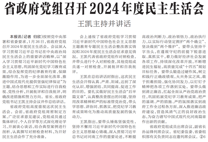 按照党中央部署和省委要求,1月26日,省政府党组召开2024年度民主生活会。会议深入学习贯彻习近平总书记在中央政治局民主生活会上的重要讲话精神,以“深入学习贯彻习近平新时代中国特色社会主义思想,巩固深化党纪学习教育成果,综合发挥党的纪律教育约束、保障激励作用,为进一步全面深化改革、推进中国式现代化提供坚强纪律保证”为主题,结合思想和工作实际进行自我检视、党性分析,开展批评和自我批评,明确改进措施和努力方向。省长、省政府党组书记王凯主持会议并作总结讲话。(今日《河南日报》1版)