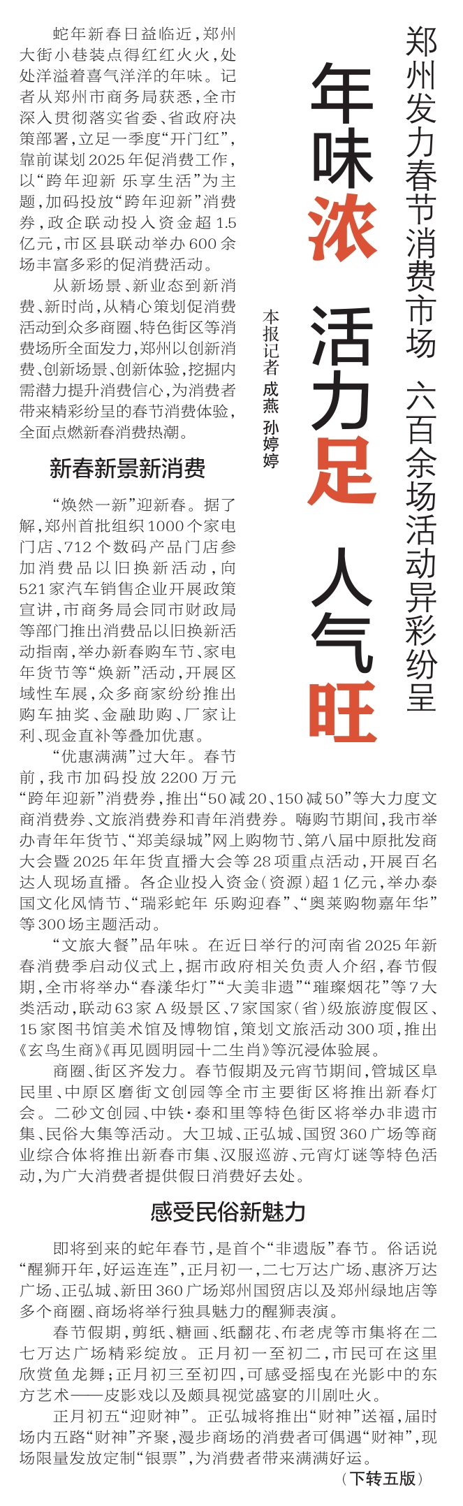 蛇年新春日益临近,郑州大街小巷装点得红红火火,处处洋溢着喜气洋洋的年味。记者从郑州市商务局获悉,全市深入贯彻落实省委、省政府决策部署,立足一季度“开门红”,靠前谋划2025年促消费工作,以“跨年迎新 乐享生活”为主题,加码投放“跨年迎新”消费券,政企联动投入资金超1.5亿元,市区县联动举办600余场丰富多彩的促消费活动。(今日《郑州日报》1版、5版)
